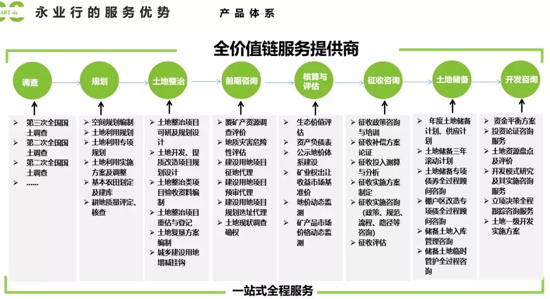 永业行拥有一支技术强、专业精、具有团队协作精神的精英团队,专业涉及自然资源研究、环境资源、价值评估、投资咨询等多个领域,长期致力于产品研发创新、技术转型升级、成果转化推广等研发,可提供从土地调查、规划整治、前期咨询、核算评估、征收咨询、土地储备、开发咨询等一条龙的全价值链服务。