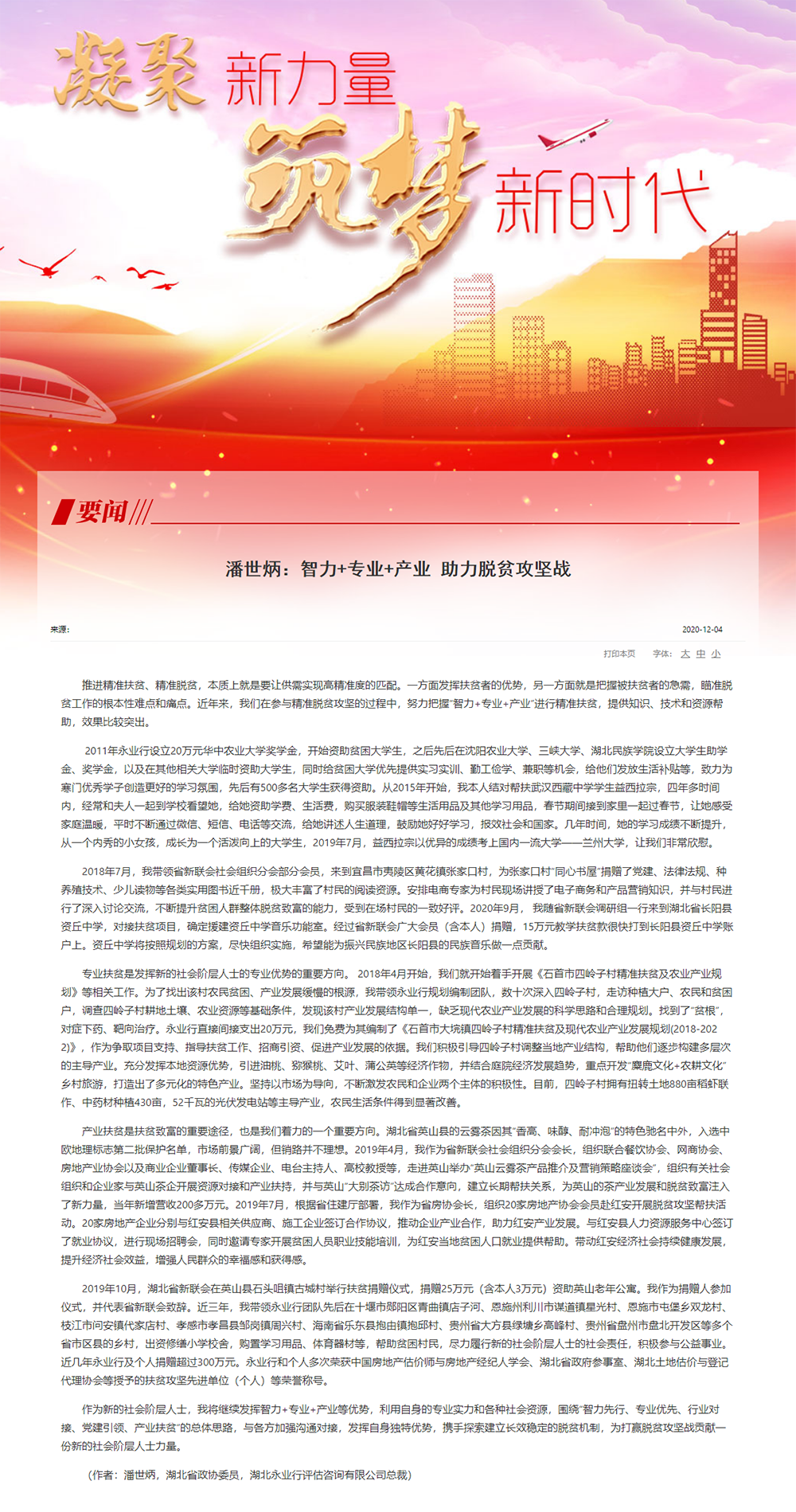 作为新的社会阶层人士,我将继续发挥智力+专业+产业等优势,利用自身的专业实力和各种社会资源,围绕“智力先行、专业优先、行业对接、党建引领、产业扶贫”的总体思路,与各方加强沟通对接,发挥自身独特优势,携手探索建立长效稳定的脱贫机制,为打赢脱贫攻坚战贡献一份新的社会阶层人士力量。