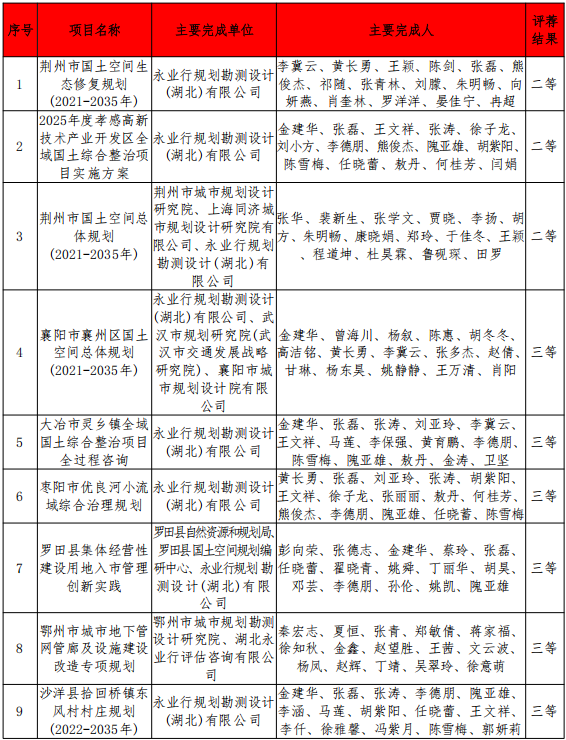 永业行荣获2025年度湖北省优秀国土空间规划成果二等奖、三等奖